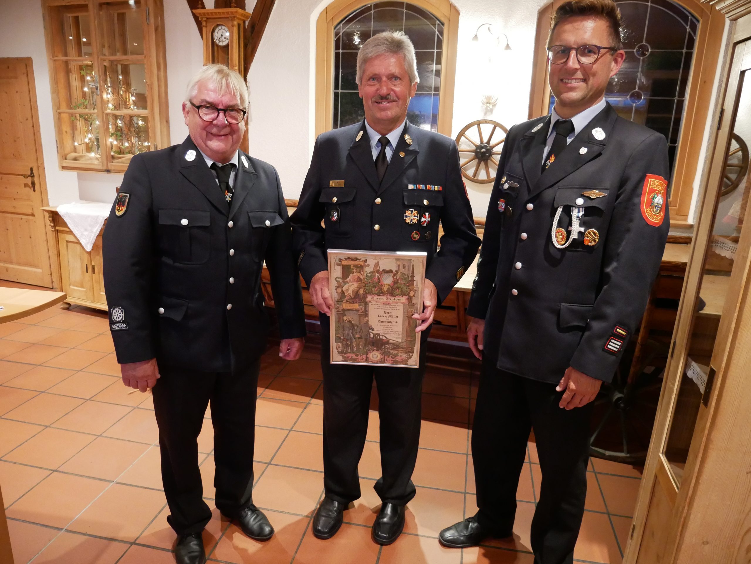 Tippmann unterstrich auch die Unterstützung beim Feuerwehrgerätehaus-Neubau und bei vielen Fahrzeugbeschaffungen. Müller habe stets auch den jüngeren Kameraden Gelegenheit gegeben Erfahrungen zu sammeln. Bei unzähligen Einsätzen habe er als Maschinist, Gruppen- oder Zugführer bzw. Einsatzleiter fungiert. Den Erfahrungsschatz habe er als Ausbilder weitervermittelt. Trotz seiner Tätigkeit als Kreisführungsdienstgrad sei er immer zur Stelle gewesen wenn es möglich war. Sogar beim Küchlbacken für die Sommerfeste habe er sich federführend engagiert.
